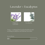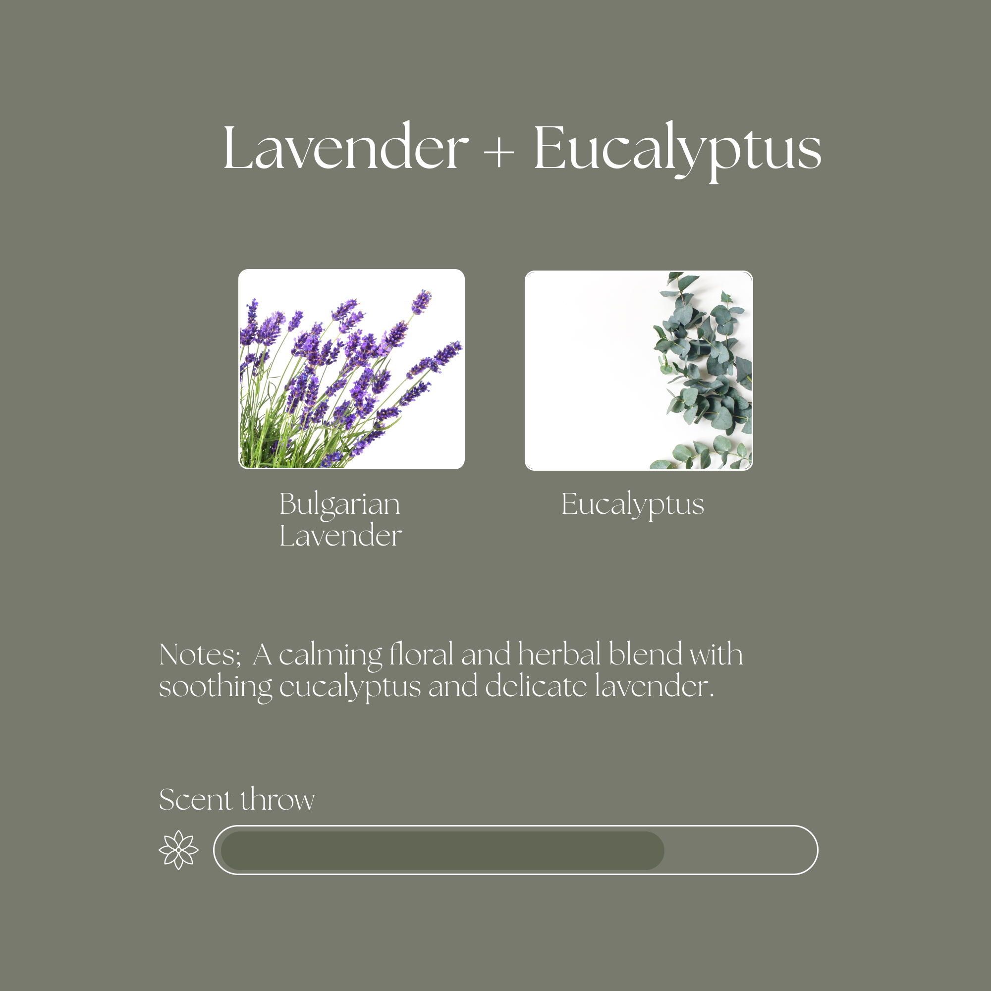 A soothing fusion of soft floral lavender and refreshing herbal eucalyptus. Calmly restorative, this blend gently relaxes the senses, inviting tranquility and peace with every breath.