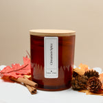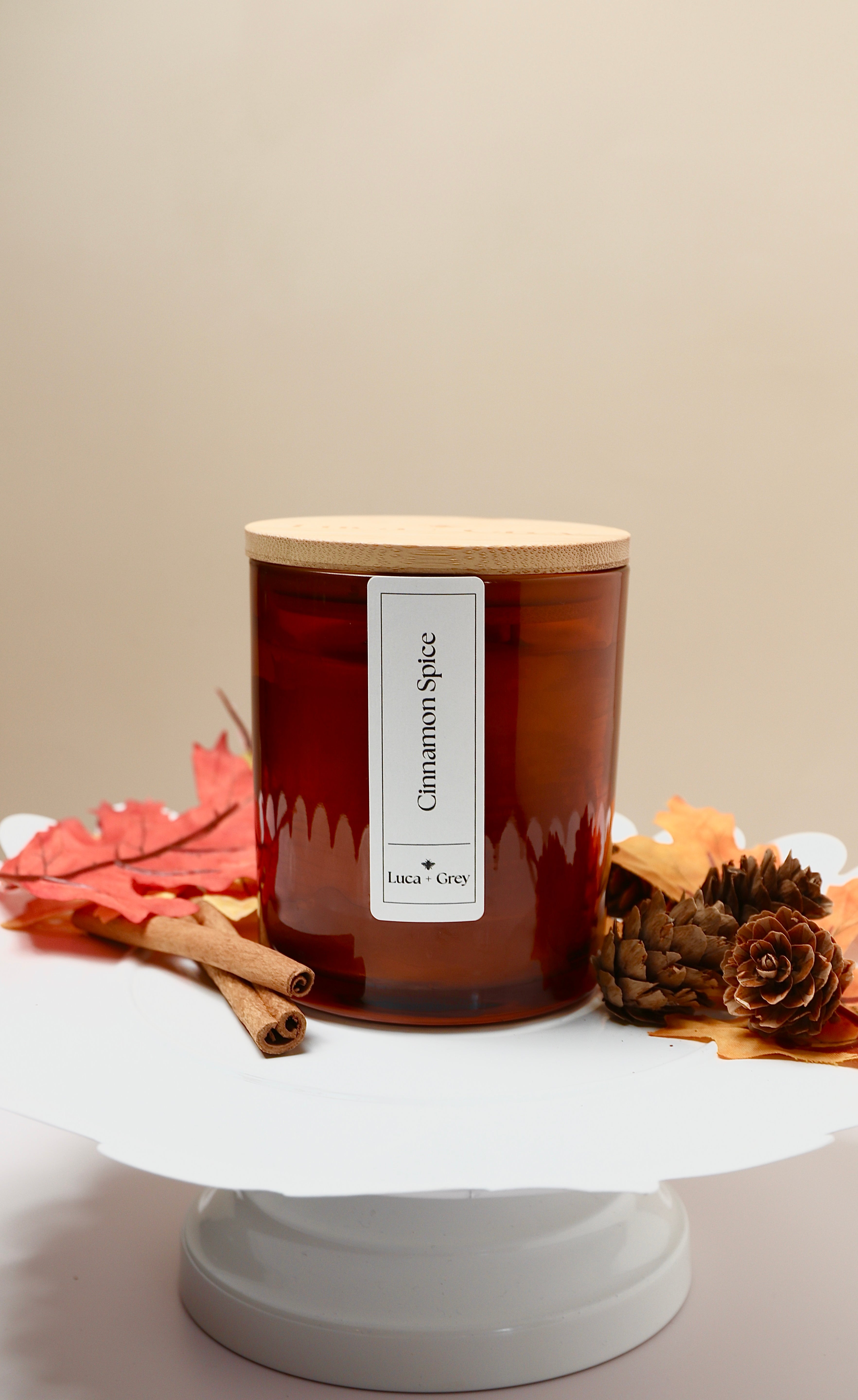 Candle labeled 'Cinnamon Spice' by Luca & Grey with autumn leaves and pinecones on a white surface.